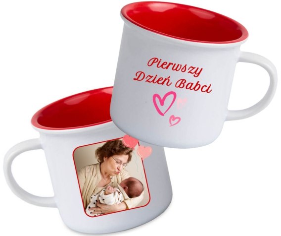 Przedstawiamy kubek ceramiczny w stylu retro z czerwonym wypełnieniem środka kubka. Na kubku nadrukujemy zdjęcie lub grafikę jaką tylko zechcesz!