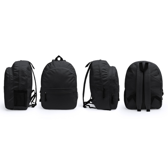 Plecak z poliestru 600D z dwiema głównymi komorami i kieszenią przednią. Jedna kieszeń boczna z siatki. Wyściełane plecy i paski na ramiona.